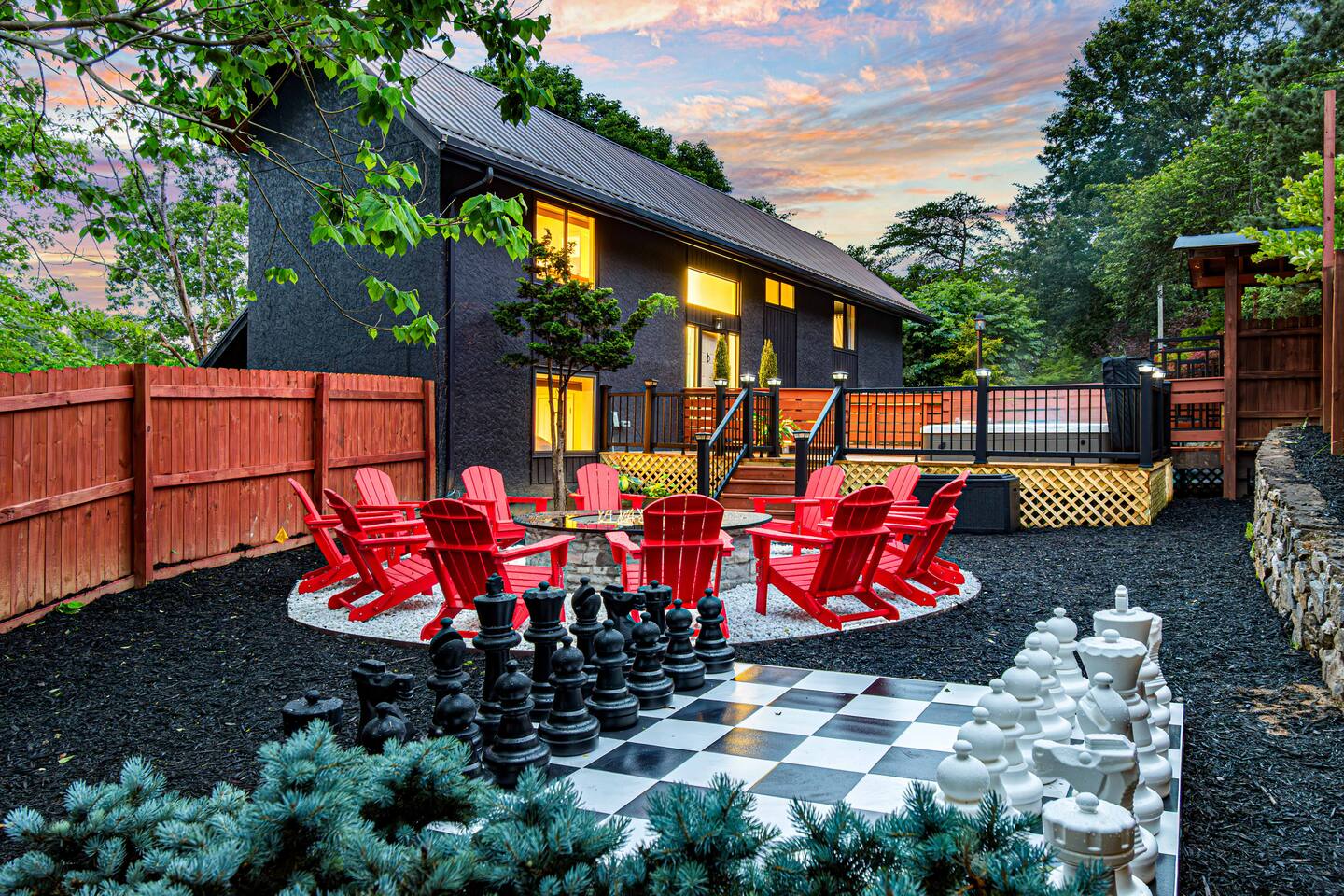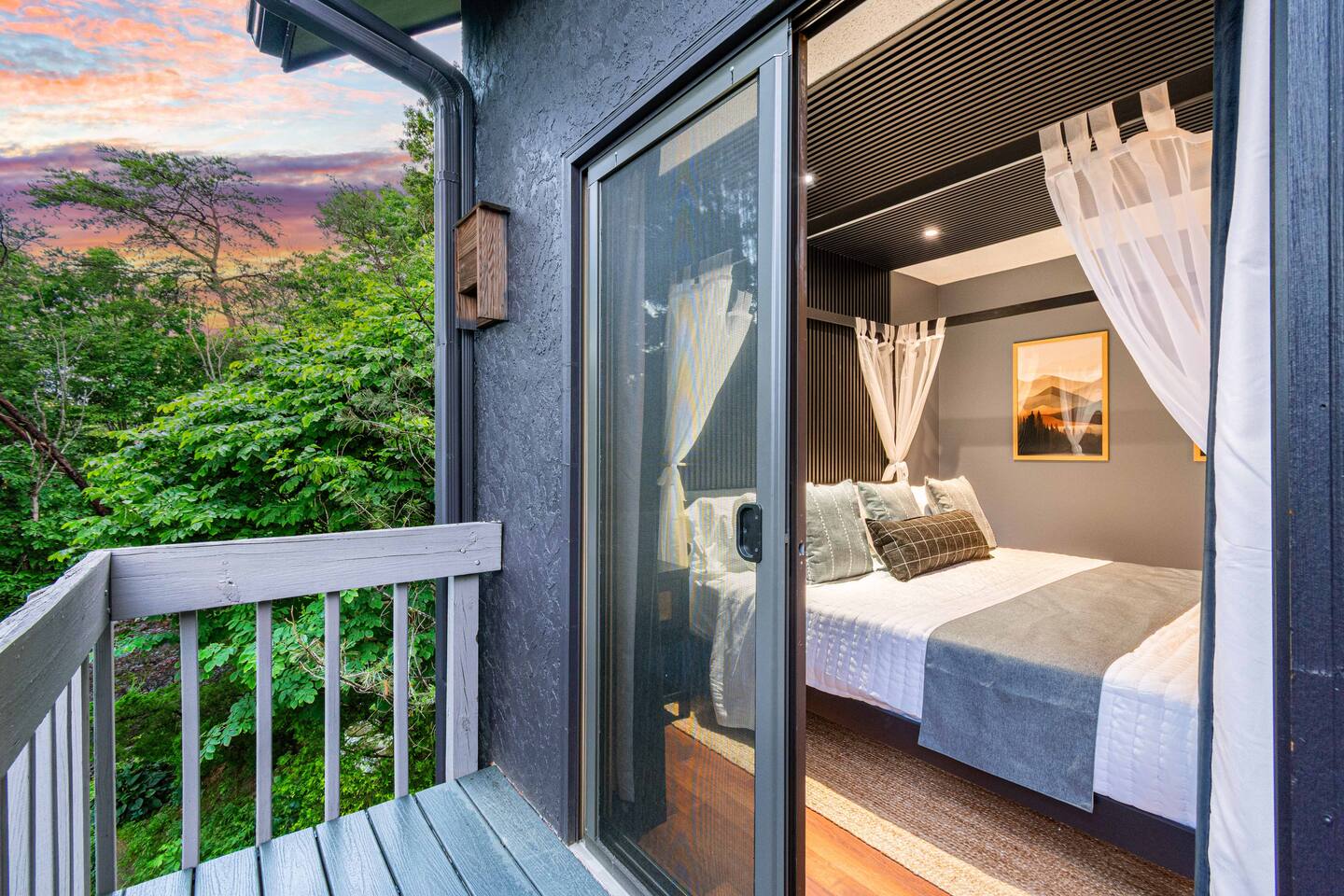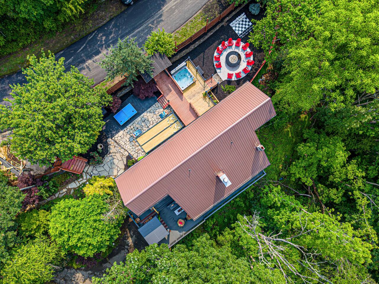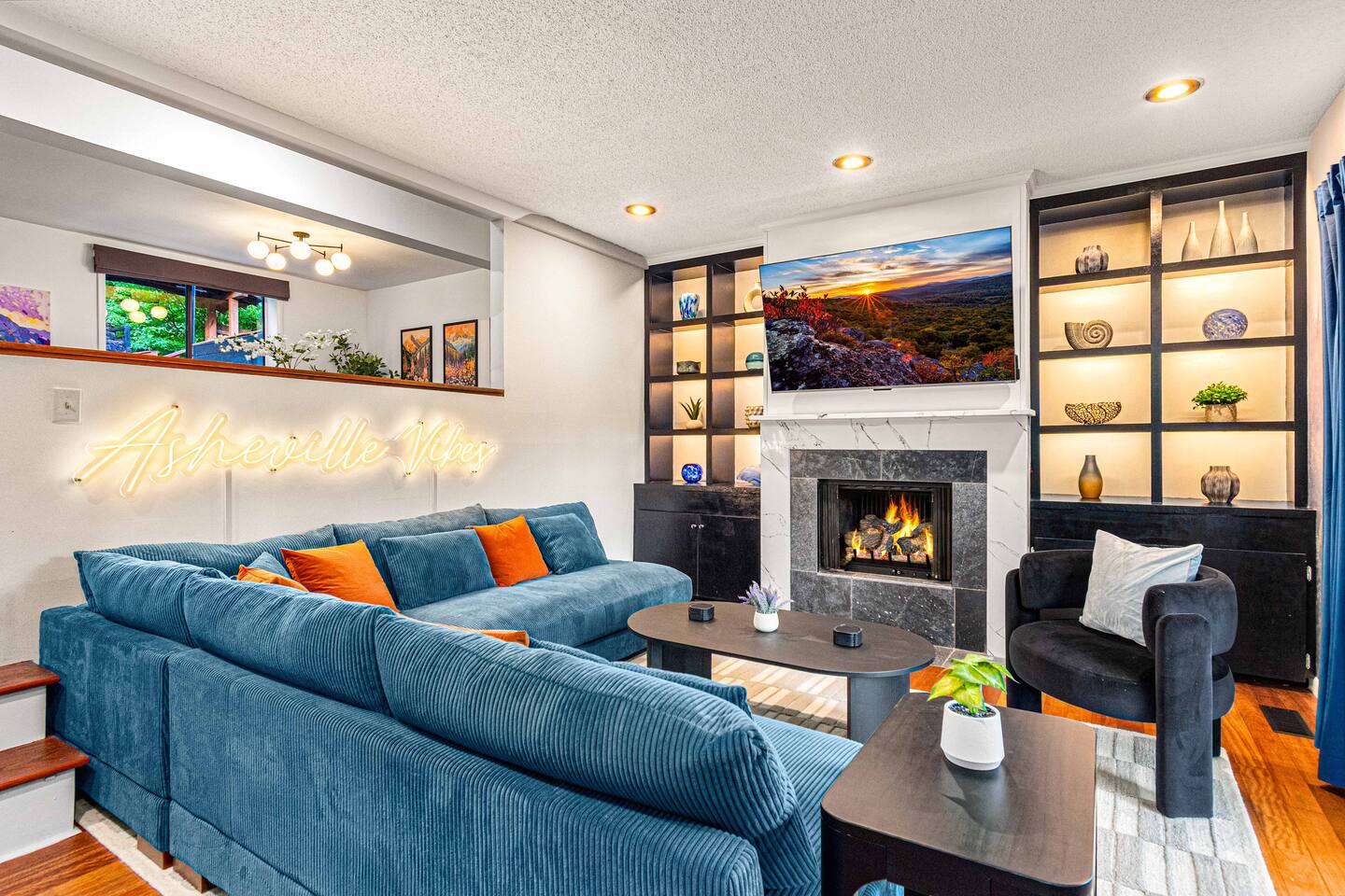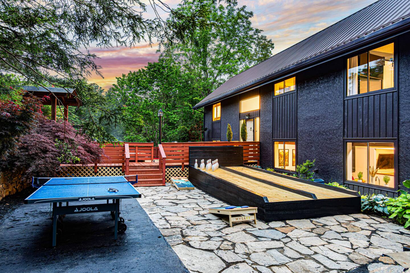 ★ OVERVIEW ★ Nestled in the heart of the breathtaking Blue Ridge Mountains and only a short 12-minute drive from the renowned restaurants and shops in downtown Asheville and a 5-minute drive from the charming town of Weaverville, this stunning designer retreat offers the perfect blend of luxury and fun. Surrounded by lush woodlands, this private 3,200 sq. ft. 6-bedroom, 4-bath mountain haven is on 1.2 acres and can accommodate up to 16 guests. It is designed for unforgettable gatherings, whether you're planning a family reunion, a getaway with friends, or a special celebration. With a fully equipped games room, a movie theater, a 2-lane bowling alley, ping pong, corn hole, a hot tub, fire pit, and mega chess, there is so much to do indoors and out that you may never want to leave. ★ LIVING AREA ★ The luxurious living room offers a serene retreat, featuring an expansive forest mural and a plush teal sectional adorned with vibrant orange cushions. The space is bathed in natural light from large sliding doors, leading to a tranquil deck with lush views. A cozy fireplace and lit art alcoves add elegance, while the modern decor and rich wood floors create a warm, inviting atmosphere perfect for relaxation and entertainment. ✔ Stylish Seating: Sink into the plush seating and indulge in absolute comfort. ✔ Modern Decor: Enjoy the curated ambiance created by the contemporary furnishings and design. ✔ Roku Smart TV: Relax after a day of hiking while watching the 65” TV. ✔ Amazon Echo: Listen to your favorite tunes on this Wi-Fi-enabled speaker. ✔ Gas Fireplace: At the flip of a switch, turn on the ambiance and enjoy the amber glow of the logs while chatting or watching TV. ✔ Games: Have fun with games night! Tons to choose from, including: Monopoly, Dominoes, Bingo, Charades, Codenames, Jenga, Uno, cards, and Jenga. ★ KITCHEN & DINING ROOM★ The gorgeous open kitchen and dining area seamlessly blend style and functionality, making it ideal for both culinary adventures and relaxed mornings. The chef’s kitchen, with its stainless steel appliances, is a culinary haven, perfect for creating memorable meals. The adjacent coffee bar is a cozy nook offering a variety of brews and syrups for coffee, tea, and hot chocolate enthusiasts. Gather around the custom-designed 12-person dining table and enjoy memorable meals in style. ✔ Designer Kitchen: Experience a well-appointed kitchen featuring an island that seamlessly combines elegance with functionality. ✔ Kitchen Amenities: Coffee maker (drip coffee maker & Nespresso), basic cooking essentials (seasonings, condiments, oil, vinegar, organic sugar, coffee, tea, hot chocolate etc.), high-end Hexclad cookware, microwave, full-sized fridge, freezer with ice-maker, gas range, gas oven, dishwasher, rice maker, toaster oven/air fryer, double waffle maker, and blender. ✔ Dining Area: Share delicious meals and create lasting memories around the chic dining table with seating for 12 and a large glass lazy-susan. ★ BEDROOMS ★ The designer decorated bedrooms all offer a tranquil escape, inspired by the surrounding mountains and forests. Each room features stunning nature-themed murals or pictures, creating a serene ambiance. Plush, premium bedding, adorned with Egyptian cotton sheets and elegant decor, complements the natural beauty, while large windows or sliding glass doors offer breathtaking views. Thoughtful touches, such as cozy seating and soft lighting, enhance the restful atmosphere, making these bedrooms a perfect retreat after a day of exploring. ✔ Luxurious Beds: Drift into dreamland on our premium beds with 4 pillows and Egyption cotton sheets. There are extra blankets if needed. ✔ Serene Ambiance: Find solace and tranquility in the tastefully designed bedrooms. ✔ Bedroom Amenities: All bedrooms include Roku Smart TVs, Amazon Echo speakers, ceiling fans, and blackout blinds or curtains. ✔ Primary Bedroom: King canopy bed with private balcony, two walk-in closets, and an en-suite bathroom with jacuzzi tub, separate shower, and makeup table. ✔ Bedroom 2: King bed with en-suite bathroom and bath/shower combo. ✔ Bedroom 3: Queen bed with en-suite bathroom with a shower. ✔ Bedroom 4: Two queen beds and sliding glass door access to outside, along with shared bathroom access with a shower. ✔ Bedroom 5: Two queen beds, along with shared bathroom access with a shower. ✔ Bedroom 6: King bed, along with shared bathroom access with a shower. ★ BATHROOMS ★ The four bathrooms are elegantly designed, each offering a unique blend of style and comfort. Featuring modern fixtures, glass vessel sinks, and sleek tile work, they provide a spa-like experience. Large mirrors and ample lighting enhance the space, while thoughtful details, such as plush towels and high-quality toiletries, ensure a luxurious stay. These bathrooms perfectly complement the serene mountain setting, offering a refreshing retreat. ✔ Modern Bathrooms: Refresh and rejuvenate in the elegantly appointed bathrooms. ✔ Bathtubs/showers: There are two bathtubs (one of them is a jacuzzi tub, one is a combo shower/bathtub), and three stand-alone showers. ✔ Essential Amenities: Enjoy the organic shampoo, conditioner, and body wash along with Q-tips and cotton balls. ★ INDOOR AMENITIES ★ ✔ Theatre: A fully decked out home theatre for 8 guests with a 100” screen, surround sound, leather reclining chairs, a fiberoptic star ceiling, and a snack bar. ✔ Games Room: Challenge your friends or family to a game of pool, poker, or Ms Pac-Man. The room also features a 16’ ceiling, a 65” Roku smart TV, classic arcade games, and board games. ✔ Office: Including a stand-up desk, perfect for digital nomads, helping you stay productive even while on vacation. ✔ Air conditioning/Heating: A central heating and cooling system is installed throughout the house. ✔ Laundry Room: Brand new high-efficiency washer and gas dryer for any laundry needs. ✔ I
