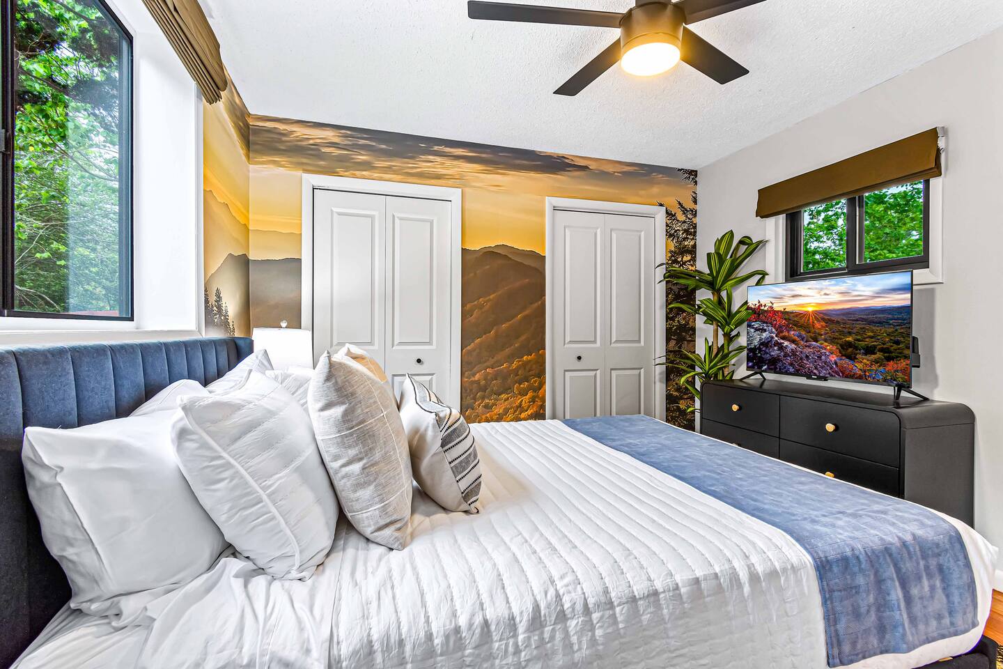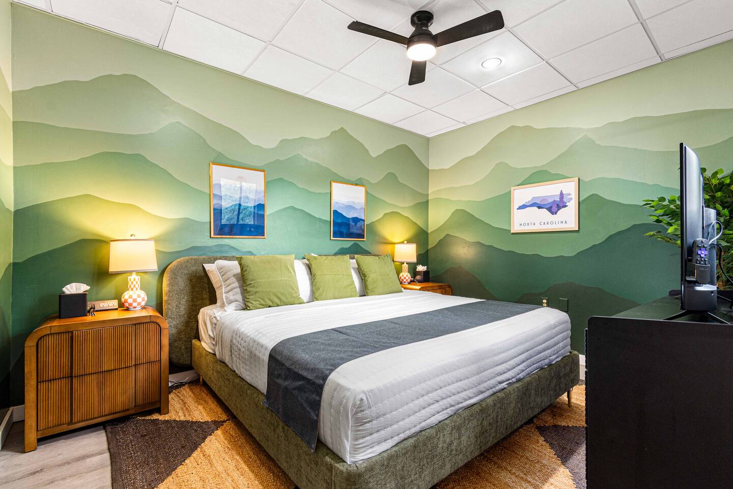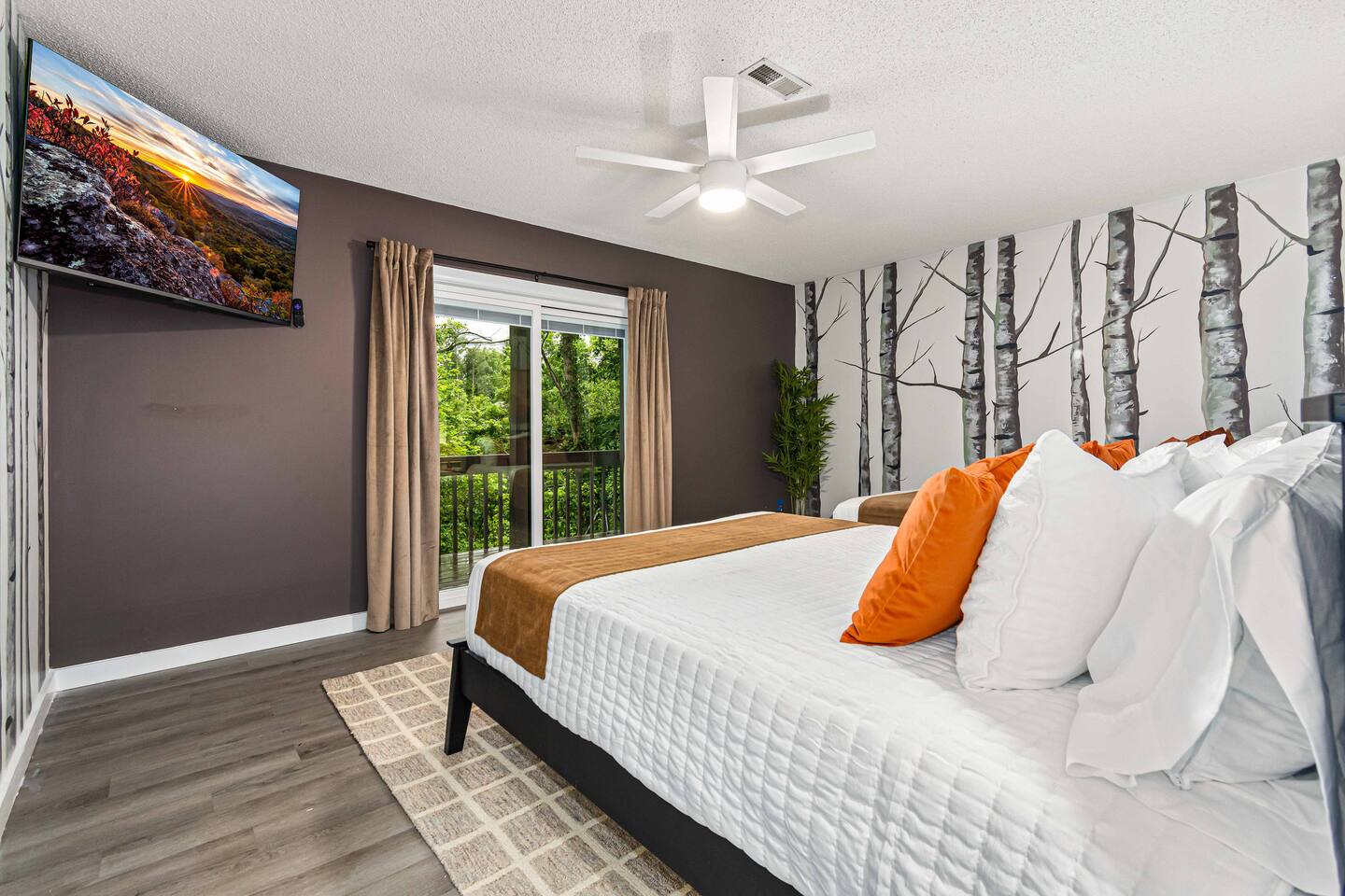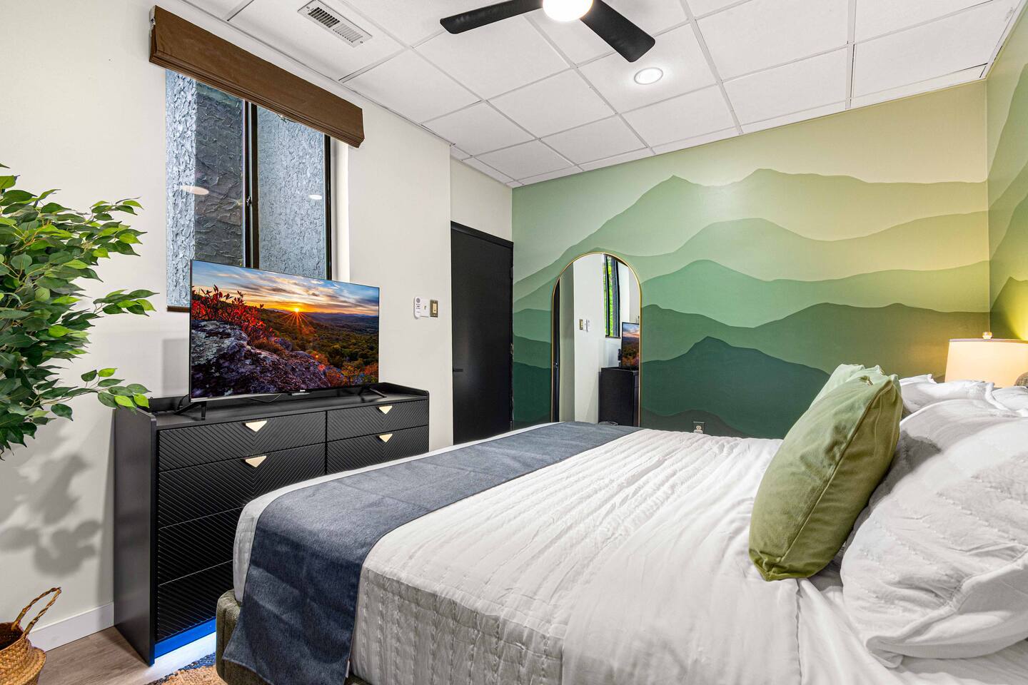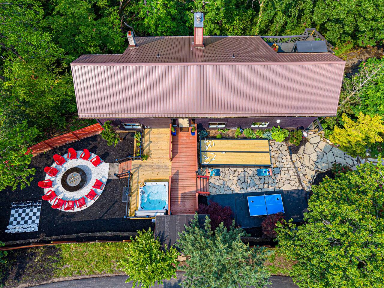 ★ OVERVIEW ★ Nestled in the heart of the breathtaking Blue Ridge Mountains and only a short 12-minute drive from the renowned restaurants and shops in downtown Asheville and a 5-minute drive from the charming town of Weaverville, this stunning designer retreat offers the perfect blend of luxury and fun. Surrounded by lush woodlands, this private 3,200 sq. ft. 6-bedroom, 4-bath mountain haven is on 1.2 acres and can accommodate up to 16 guests. It is designed for unforgettable gatherings, whether you're planning a family reunion, a getaway with friends, or a special celebration. With a fully equipped games room, a movie theater, a 2-lane bowling alley, ping pong, corn hole, a hot tub, fire pit, and mega chess, there is so much to do indoors and out that you may never want to leave. ★ LIVING AREA ★ The luxurious living room offers a serene retreat, featuring an expansive forest mural and a plush teal sectional adorned with vibrant orange cushions. The space is bathed in natural light from large sliding doors, leading to a tranquil deck with lush views. A cozy fireplace and lit art alcoves add elegance, while the modern decor and rich wood floors create a warm, inviting atmosphere perfect for relaxation and entertainment. ✔ Stylish Seating: Sink into the plush seating and indulge in absolute comfort. ✔ Modern Decor: Enjoy the curated ambiance created by the contemporary furnishings and design. ✔ Roku Smart TV: Relax after a day of hiking while watching the 65” TV. ✔ Amazon Echo: Listen to your favorite tunes on this Wi-Fi-enabled speaker. ✔ Gas Fireplace: At the flip of a switch, turn on the ambiance and enjoy the amber glow of the logs while chatting or watching TV. ✔ Games: Have fun with games night! Tons to choose from, including: Monopoly, Dominoes, Bingo, Charades, Codenames, Jenga, Uno, cards, and Jenga. ★ KITCHEN & DINING ROOM★ The gorgeous open kitchen and dining area seamlessly blend style and functionality, making it ideal for both culinary adventures and relaxed mornings. The chef’s kitchen, with its stainless steel appliances, is a culinary haven, perfect for creating memorable meals. The adjacent coffee bar is a cozy nook offering a variety of brews and syrups for coffee, tea, and hot chocolate enthusiasts. Gather around the custom-designed 12-person dining table and enjoy memorable meals in style. ✔ Designer Kitchen: Experience a well-appointed kitchen featuring an island that seamlessly combines elegance with functionality. ✔ Kitchen Amenities: Coffee maker (drip coffee maker & Nespresso), basic cooking essentials (seasonings, condiments, oil, vinegar, organic sugar, coffee, tea, hot chocolate etc.), high-end Hexclad cookware, microwave, full-sized fridge, freezer with ice-maker, gas range, gas oven, dishwasher, rice maker, toaster oven/air fryer, double waffle maker, and blender. ✔ Dining Area: Share delicious meals and create lasting memories around the chic dining table with seating for 12 and a large glass lazy-susan. ★ BEDROOMS ★ The designer decorated bedrooms all offer a tranquil escape, inspired by the surrounding mountains and forests. Each room features stunning nature-themed murals or pictures, creating a serene ambiance. Plush, premium bedding, adorned with Egyptian cotton sheets and elegant decor, complements the natural beauty, while large windows or sliding glass doors offer breathtaking views. Thoughtful touches, such as cozy seating and soft lighting, enhance the restful atmosphere, making these bedrooms a perfect retreat after a day of exploring. ✔ Luxurious Beds: Drift into dreamland on our premium beds with 4 pillows and Egyption cotton sheets. There are extra blankets if needed. ✔ Serene Ambiance: Find solace and tranquility in the tastefully designed bedrooms. ✔ Bedroom Amenities: All bedrooms include Roku Smart TVs, Amazon Echo speakers, ceiling fans, and blackout blinds or curtains. ✔ Primary Bedroom: King canopy bed with private balcony, two walk-in closets, and an en-suite bathroom with jacuzzi tub, separate shower, and makeup table. ✔ Bedroom 2: King bed with en-suite bathroom and bath/shower combo. ✔ Bedroom 3: Queen bed with en-suite bathroom with a shower. ✔ Bedroom 4: Two queen beds and sliding glass door access to outside, along with shared bathroom access with a shower. ✔ Bedroom 5: Two queen beds, along with shared bathroom access with a shower. ✔ Bedroom 6: King bed, along with shared bathroom access with a shower. ★ BATHROOMS ★ The four bathrooms are elegantly designed, each offering a unique blend of style and comfort. Featuring modern fixtures, glass vessel sinks, and sleek tile work, they provide a spa-like experience. Large mirrors and ample lighting enhance the space, while thoughtful details, such as plush towels and high-quality toiletries, ensure a luxurious stay. These bathrooms perfectly complement the serene mountain setting, offering a refreshing retreat. ✔ Modern Bathrooms: Refresh and rejuvenate in the elegantly appointed bathrooms. ✔ Bathtubs/showers: There are two bathtubs (one of them is a jacuzzi tub, one is a combo shower/bathtub), and three stand-alone showers. ✔ Essential Amenities: Enjoy the organic shampoo, conditioner, and body wash along with Q-tips and cotton balls. ★ INDOOR AMENITIES ★ ✔ Theatre: A fully decked out home theatre for 8 guests with a 100” screen, surround sound, leather reclining chairs, a fiberoptic star ceiling, and a snack bar. ✔ Games Room: Challenge your friends or family to a game of pool, poker, or Ms Pac-Man. The room also features a 16’ ceiling, a 65” Roku smart TV, classic arcade games, and board games. ✔ Office: Including a stand-up desk, perfect for digital nomads, helping you stay productive even while on vacation. ✔ Air conditioning/Heating: A central heating and cooling system is installed throughout the house. ✔ Laundry Room: Brand new high-efficiency washer and gas dryer for any laundry needs. ✔ I