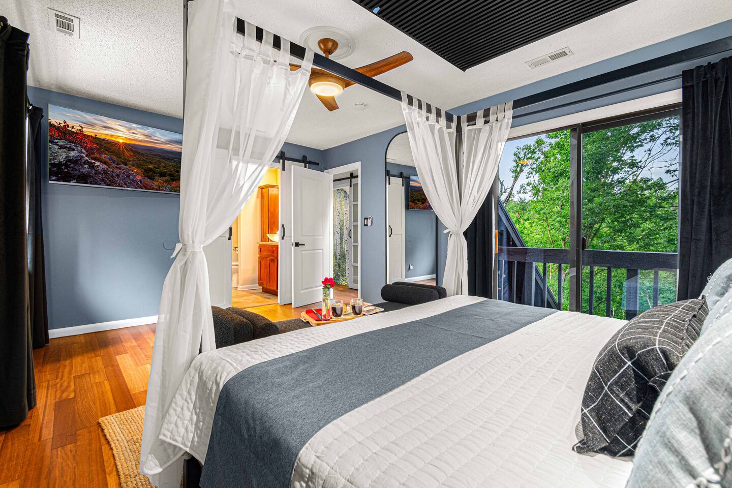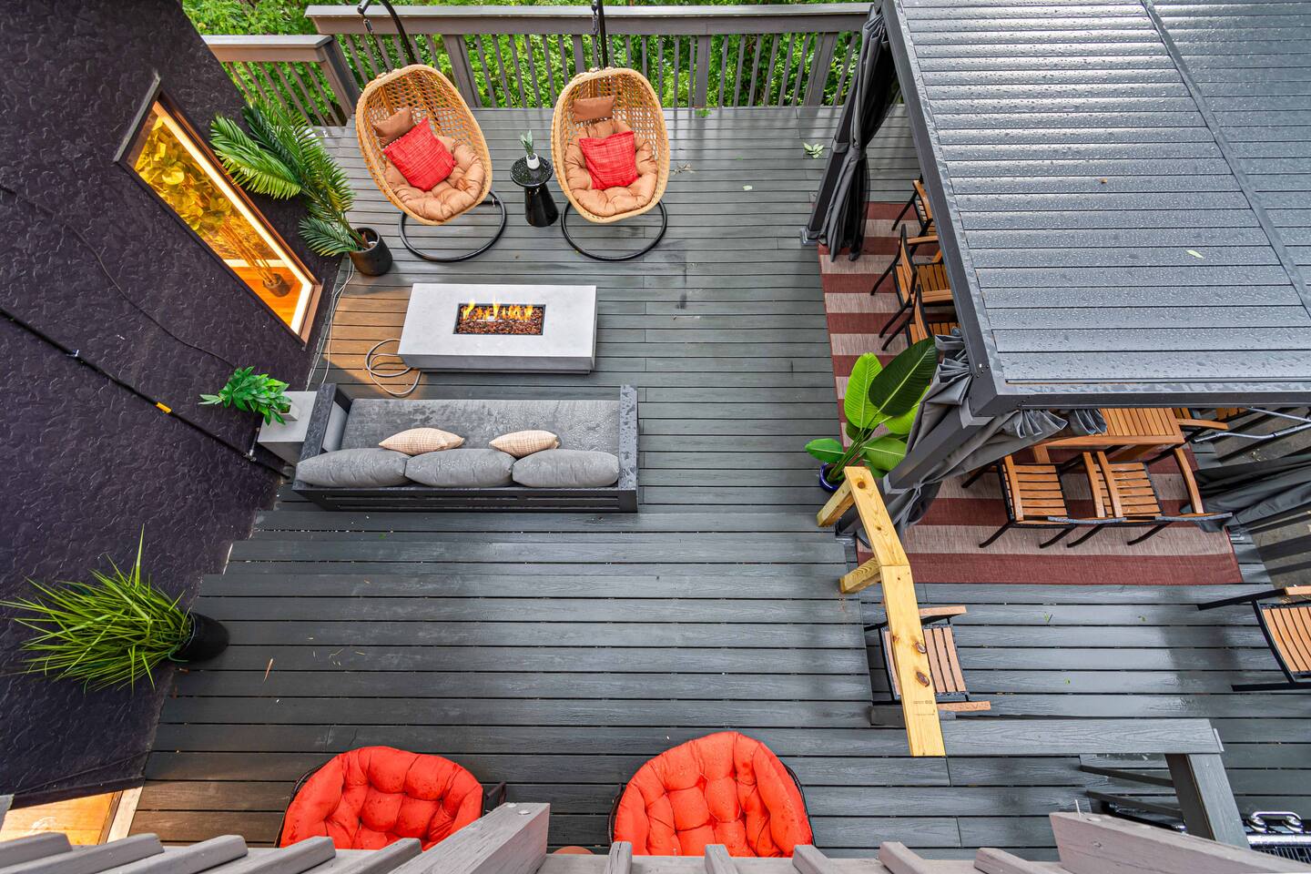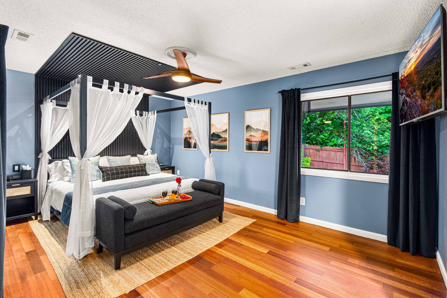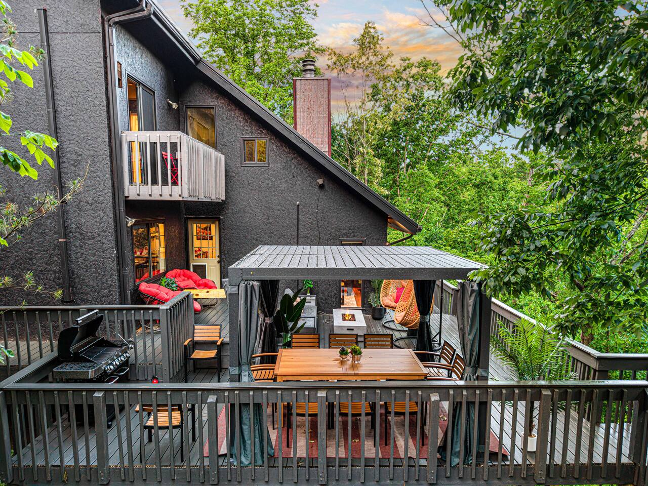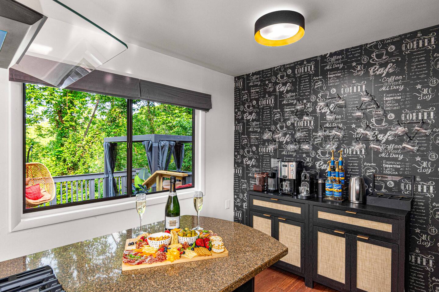 ★ OVERVIEW ★ Nestled in the heart of the breathtaking Blue Ridge Mountains and only a short 12-minute drive from the renowned restaurants and shops in downtown Asheville and a 5-minute drive from the charming town of Weaverville, this stunning designer retreat offers the perfect blend of luxury and fun. Surrounded by lush woodlands, this private 3,200 sq. ft. 6-bedroom, 4-bath mountain haven is on 1.2 acres and can accommodate up to 16 guests. It is designed for unforgettable gatherings, whether you're planning a family reunion, a getaway with friends, or a special celebration. With a fully equipped games room, a movie theater, a 2-lane bowling alley, ping pong, corn hole, a hot tub, fire pit, and mega chess, there is so much to do indoors and out that you may never want to leave. ★ LIVING AREA ★ The luxurious living room offers a serene retreat, featuring an expansive forest mural and a plush teal sectional adorned with vibrant orange cushions. The space is bathed in natural light from large sliding doors, leading to a tranquil deck with lush views. A cozy fireplace and lit art alcoves add elegance, while the modern decor and rich wood floors create a warm, inviting atmosphere perfect for relaxation and entertainment. ✔ Stylish Seating: Sink into the plush seating and indulge in absolute comfort. ✔ Modern Decor: Enjoy the curated ambiance created by the contemporary furnishings and design. ✔ Roku Smart TV: Relax after a day of hiking while watching the 65” TV. ✔ Amazon Echo: Listen to your favorite tunes on this Wi-Fi-enabled speaker. ✔ Gas Fireplace: At the flip of a switch, turn on the ambiance and enjoy the amber glow of the logs while chatting or watching TV. ✔ Games: Have fun with games night! Tons to choose from, including: Monopoly, Dominoes, Bingo, Charades, Codenames, Jenga, Uno, cards, and Jenga. ★ KITCHEN & DINING ROOM★ The gorgeous open kitchen and dining area seamlessly blend style and functionality, making it ideal for both culinary adventures and relaxed mornings. The chef’s kitchen, with its stainless steel appliances, is a culinary haven, perfect for creating memorable meals. The adjacent coffee bar is a cozy nook offering a variety of brews and syrups for coffee, tea, and hot chocolate enthusiasts. Gather around the custom-designed 12-person dining table and enjoy memorable meals in style. ✔ Designer Kitchen: Experience a well-appointed kitchen featuring an island that seamlessly combines elegance with functionality. ✔ Kitchen Amenities: Coffee maker (drip coffee maker & Nespresso), basic cooking essentials (seasonings, condiments, oil, vinegar, organic sugar, coffee, tea, hot chocolate etc.), high-end Hexclad cookware, microwave, full-sized fridge, freezer with ice-maker, gas range, gas oven, dishwasher, rice maker, toaster oven/air fryer, double waffle maker, and blender. ✔ Dining Area: Share delicious meals and create lasting memories around the chic dining table with seating for 12 and a large glass lazy-susan. ★ BEDROOMS ★ The designer decorated bedrooms all offer a tranquil escape, inspired by the surrounding mountains and forests. Each room features stunning nature-themed murals or pictures, creating a serene ambiance. Plush, premium bedding, adorned with Egyptian cotton sheets and elegant decor, complements the natural beauty, while large windows or sliding glass doors offer breathtaking views. Thoughtful touches, such as cozy seating and soft lighting, enhance the restful atmosphere, making these bedrooms a perfect retreat after a day of exploring. ✔ Luxurious Beds: Drift into dreamland on our premium beds with 4 pillows and Egyption cotton sheets. There are extra blankets if needed. ✔ Serene Ambiance: Find solace and tranquility in the tastefully designed bedrooms. ✔ Bedroom Amenities: All bedrooms include Roku Smart TVs, Amazon Echo speakers, ceiling fans, and blackout blinds or curtains. ✔ Primary Bedroom: King canopy bed with private balcony, two walk-in closets, and an en-suite bathroom with jacuzzi tub, separate shower, and makeup table. ✔ Bedroom 2: King bed with en-suite bathroom and bath/shower combo. ✔ Bedroom 3: Queen bed with en-suite bathroom with a shower. ✔ Bedroom 4: Two queen beds and sliding glass door access to outside, along with shared bathroom access with a shower. ✔ Bedroom 5: Two queen beds, along with shared bathroom access with a shower. ✔ Bedroom 6: King bed, along with shared bathroom access with a shower. ★ BATHROOMS ★ The four bathrooms are elegantly designed, each offering a unique blend of style and comfort. Featuring modern fixtures, glass vessel sinks, and sleek tile work, they provide a spa-like experience. Large mirrors and ample lighting enhance the space, while thoughtful details, such as plush towels and high-quality toiletries, ensure a luxurious stay. These bathrooms perfectly complement the serene mountain setting, offering a refreshing retreat. ✔ Modern Bathrooms: Refresh and rejuvenate in the elegantly appointed bathrooms. ✔ Bathtubs/showers: There are two bathtubs (one of them is a jacuzzi tub, one is a combo shower/bathtub), and three stand-alone showers. ✔ Essential Amenities: Enjoy the organic shampoo, conditioner, and body wash along with Q-tips and cotton balls. ★ INDOOR AMENITIES ★ ✔ Theatre: A fully decked out home theatre for 8 guests with a 100” screen, surround sound, leather reclining chairs, a fiberoptic star ceiling, and a snack bar. ✔ Games Room: Challenge your friends or family to a game of pool, poker, or Ms Pac-Man. The room also features a 16’ ceiling, a 65” Roku smart TV, classic arcade games, and board games. ✔ Office: Including a stand-up desk, perfect for digital nomads, helping you stay productive even while on vacation. ✔ Air conditioning/Heating: A central heating and cooling system is installed throughout the house. ✔ Laundry Room: Brand new high-efficiency washer and gas dryer for any laundry needs. ✔ I