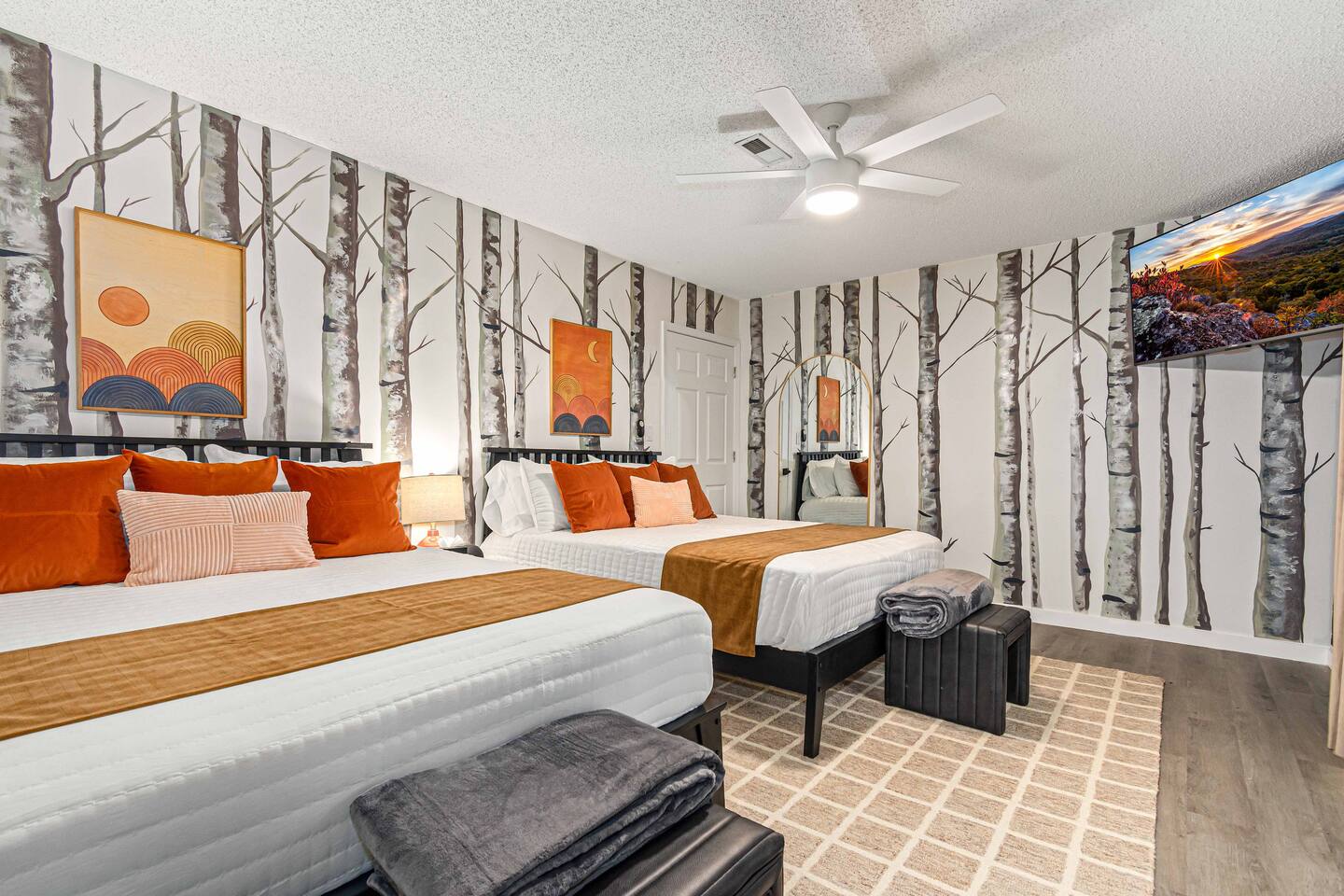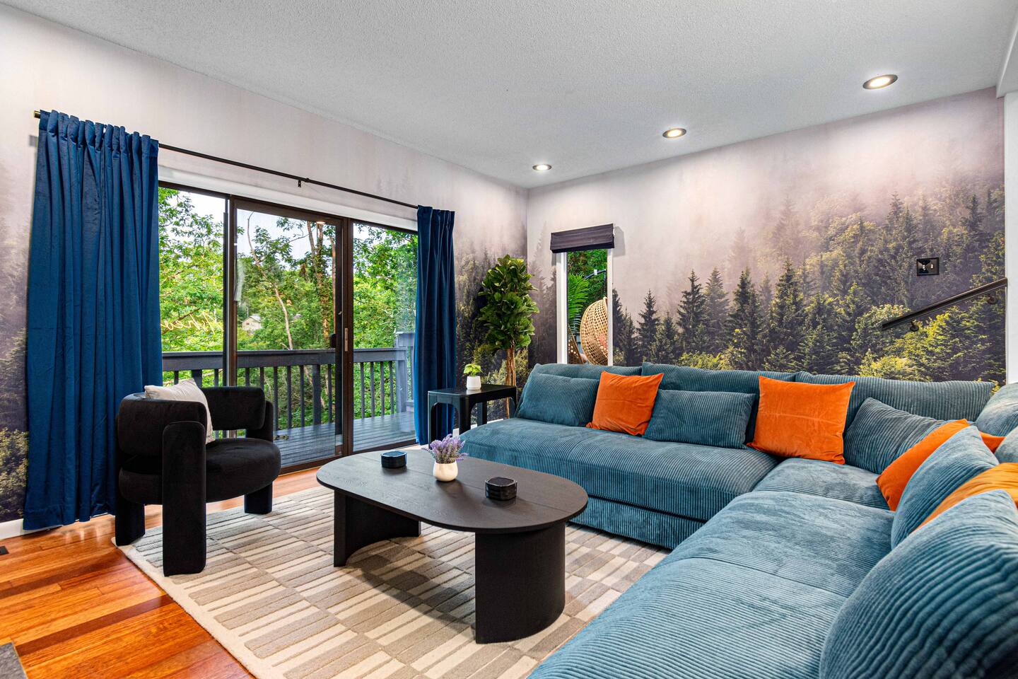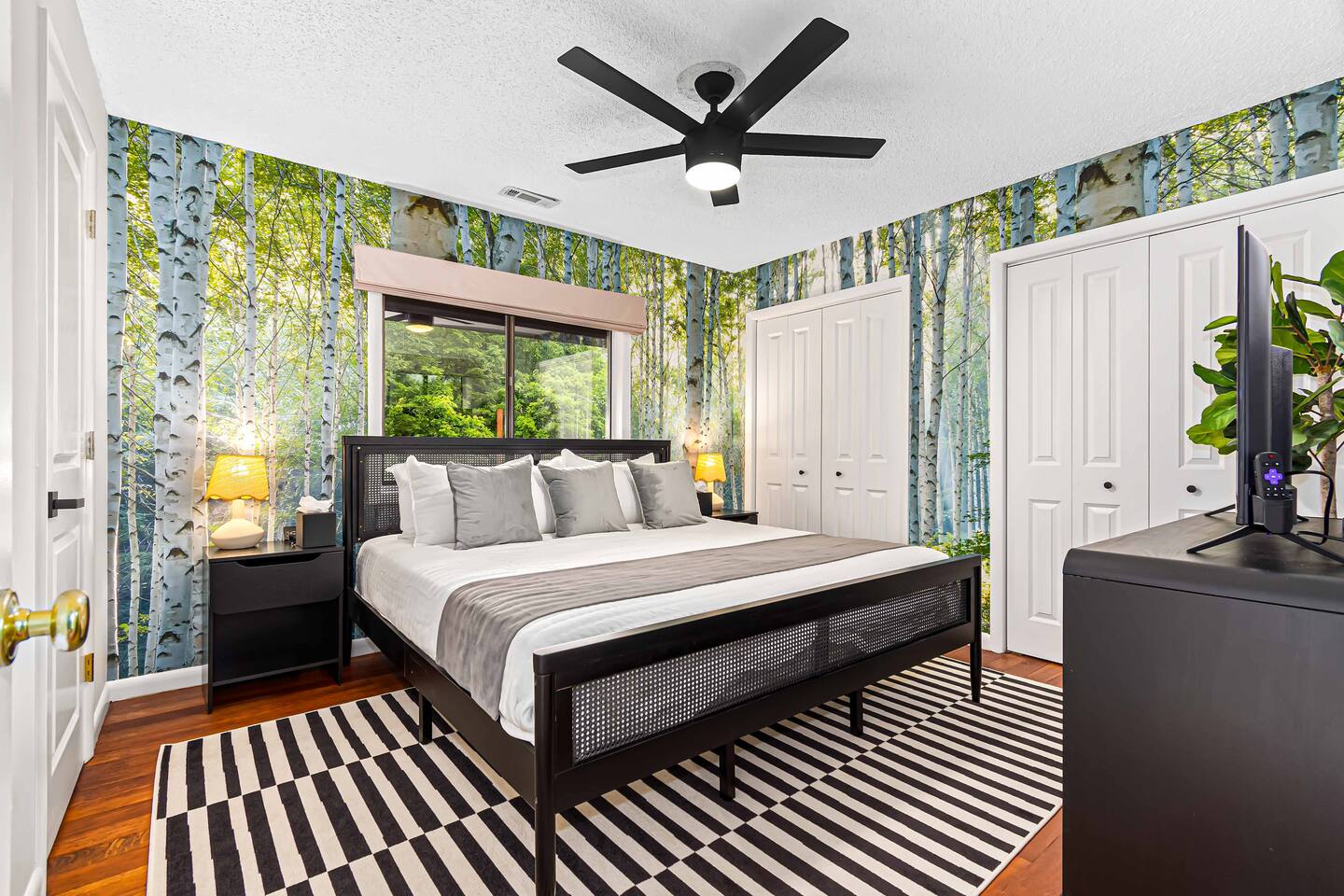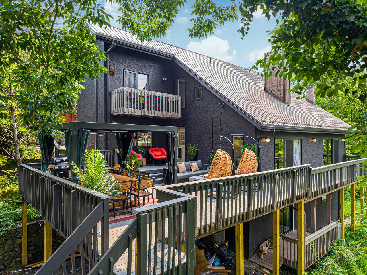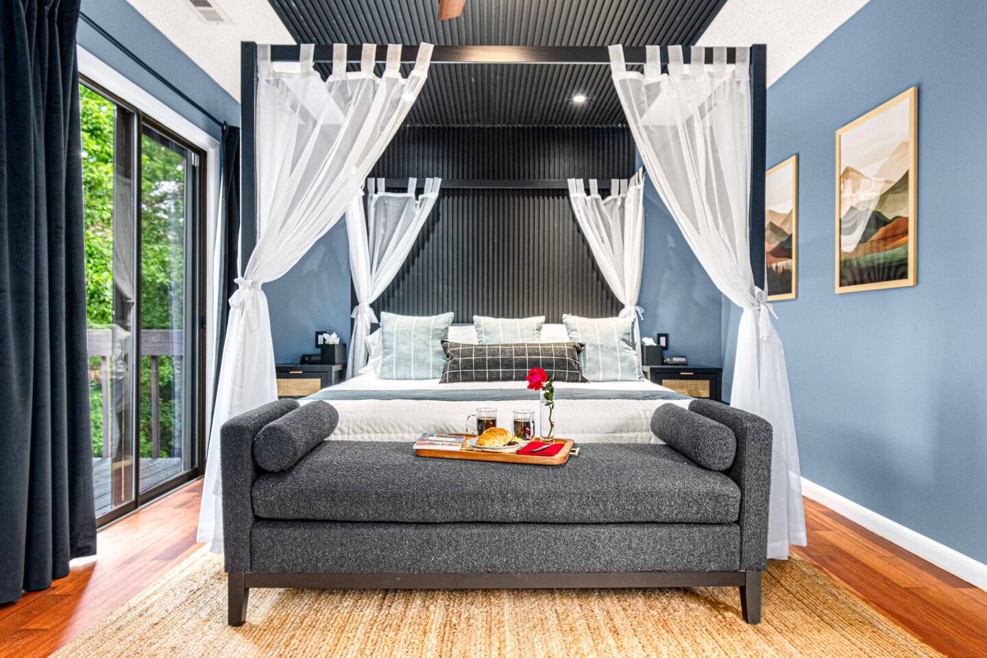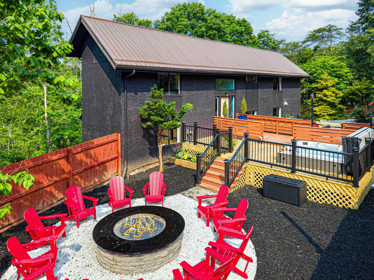 ★ OVERVIEW ★ Nestled in the heart of the breathtaking Blue Ridge Mountains and only a short 12-minute drive from the renowned restaurants and shops in downtown Asheville and a 5-minute drive from the charming town of Weaverville, this stunning designer retreat offers the perfect blend of luxury and fun. Surrounded by lush woodlands, this private 3,200 sq. ft. 6-bedroom, 4-bath mountain haven is on 1.2 acres and can accommodate up to 16 guests. It is designed for unforgettable gatherings, whether you're planning a family reunion, a getaway with friends, or a special celebration. With a fully equipped games room, a movie theater, a 2-lane bowling alley, ping pong, corn hole, a hot tub, fire pit, and mega chess, there is so much to do indoors and out that you may never want to leave. ★ LIVING AREA ★ The luxurious living room offers a serene retreat, featuring an expansive forest mural and a plush teal sectional adorned with vibrant orange cushions. The space is bathed in natural light from large sliding doors, leading to a tranquil deck with lush views. A cozy fireplace and lit art alcoves add elegance, while the modern decor and rich wood floors create a warm, inviting atmosphere perfect for relaxation and entertainment. ✔ Stylish Seating: Sink into the plush seating and indulge in absolute comfort. ✔ Modern Decor: Enjoy the curated ambiance created by the contemporary furnishings and design. ✔ Roku Smart TV: Relax after a day of hiking while watching the 65” TV. ✔ Amazon Echo: Listen to your favorite tunes on this Wi-Fi-enabled speaker. ✔ Gas Fireplace: At the flip of a switch, turn on the ambiance and enjoy the amber glow of the logs while chatting or watching TV. ✔ Games: Have fun with games night! Tons to choose from, including: Monopoly, Dominoes, Bingo, Charades, Codenames, Jenga, Uno, cards, and Jenga. ★ KITCHEN & DINING ROOM★ The gorgeous open kitchen and dining area seamlessly blend style and functionality, making it ideal for both culinary adventures and relaxed mornings. The chef’s kitchen, with its stainless steel appliances, is a culinary haven, perfect for creating memorable meals. The adjacent coffee bar is a cozy nook offering a variety of brews and syrups for coffee, tea, and hot chocolate enthusiasts. Gather around the custom-designed 12-person dining table and enjoy memorable meals in style. ✔ Designer Kitchen: Experience a well-appointed kitchen featuring an island that seamlessly combines elegance with functionality. ✔ Kitchen Amenities: Coffee maker (drip coffee maker & Nespresso), basic cooking essentials (seasonings, condiments, oil, vinegar, organic sugar, coffee, tea, hot chocolate etc.), high-end Hexclad cookware, microwave, full-sized fridge, freezer with ice-maker, gas range, gas oven, dishwasher, rice maker, toaster oven/air fryer, double waffle maker, and blender. ✔ Dining Area: Share delicious meals and create lasting memories around the chic dining table with seating for 12 and a large glass lazy-susan. ★ BEDROOMS ★ The designer decorated bedrooms all offer a tranquil escape, inspired by the surrounding mountains and forests. Each room features stunning nature-themed murals or pictures, creating a serene ambiance. Plush, premium bedding, adorned with Egyptian cotton sheets and elegant decor, complements the natural beauty, while large windows or sliding glass doors offer breathtaking views. Thoughtful touches, such as cozy seating and soft lighting, enhance the restful atmosphere, making these bedrooms a perfect retreat after a day of exploring. ✔ Luxurious Beds: Drift into dreamland on our premium beds with 4 pillows and Egyption cotton sheets. There are extra blankets if needed. ✔ Serene Ambiance: Find solace and tranquility in the tastefully designed bedrooms. ✔ Bedroom Amenities: All bedrooms include Roku Smart TVs, Amazon Echo speakers, ceiling fans, and blackout blinds or curtains. ✔ Primary Bedroom: King canopy bed with private balcony, two walk-in closets, and an en-suite bathroom with jacuzzi tub, separate shower, and makeup table. ✔ Bedroom 2: King bed with en-suite bathroom and bath/shower combo. ✔ Bedroom 3: Queen bed with en-suite bathroom with a shower. ✔ Bedroom 4: Two queen beds and sliding glass door access to outside, along with shared bathroom access with a shower. ✔ Bedroom 5: Two queen beds, along with shared bathroom access with a shower. ✔ Bedroom 6: King bed, along with shared bathroom access with a shower. ★ BATHROOMS ★ The four bathrooms are elegantly designed, each offering a unique blend of style and comfort. Featuring modern fixtures, glass vessel sinks, and sleek tile work, they provide a spa-like experience. Large mirrors and ample lighting enhance the space, while thoughtful details, such as plush towels and high-quality toiletries, ensure a luxurious stay. These bathrooms perfectly complement the serene mountain setting, offering a refreshing retreat. ✔ Modern Bathrooms: Refresh and rejuvenate in the elegantly appointed bathrooms. ✔ Bathtubs/showers: There are two bathtubs (one of them is a jacuzzi tub, one is a combo shower/bathtub), and three stand-alone showers. ✔ Essential Amenities: Enjoy the organic shampoo, conditioner, and body wash along with Q-tips and cotton balls. ★ INDOOR AMENITIES ★ ✔ Theatre: A fully decked out home theatre for 8 guests with a 100” screen, surround sound, leather reclining chairs, a fiberoptic star ceiling, and a snack bar. ✔ Games Room: Challenge your friends or family to a game of pool, poker, or Ms Pac-Man. The room also features a 16’ ceiling, a 65” Roku smart TV, classic arcade games, and board games. ✔ Office: Including a stand-up desk, perfect for digital nomads, helping you stay productive even while on vacation. ✔ Air conditioning/Heating: A central heating and cooling system is installed throughout the house. ✔ Laundry Room: Brand new high-efficiency washer and gas dryer for any laundry needs. ✔ I