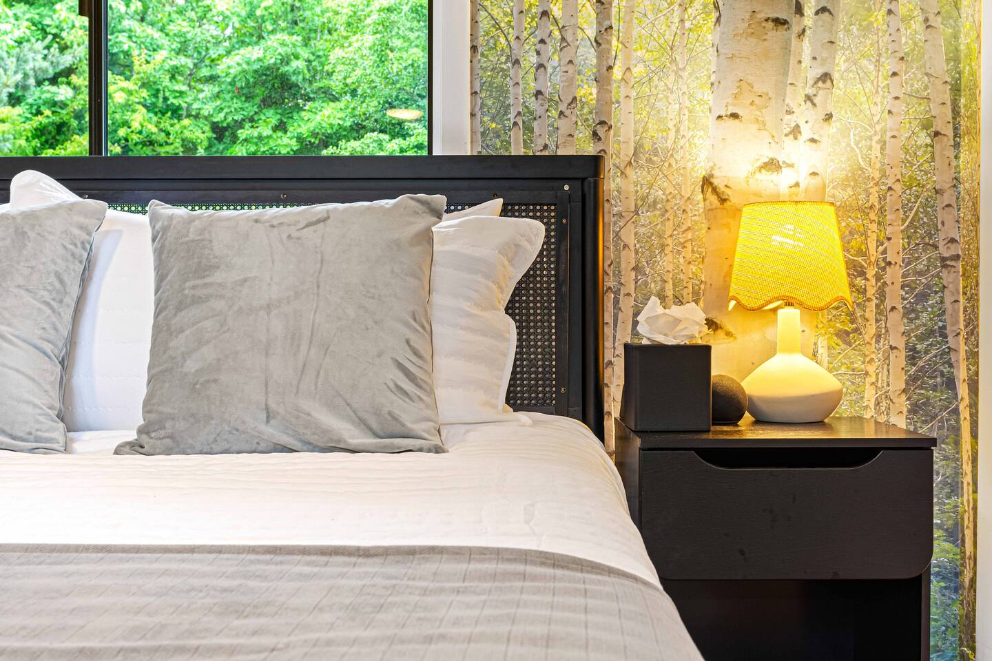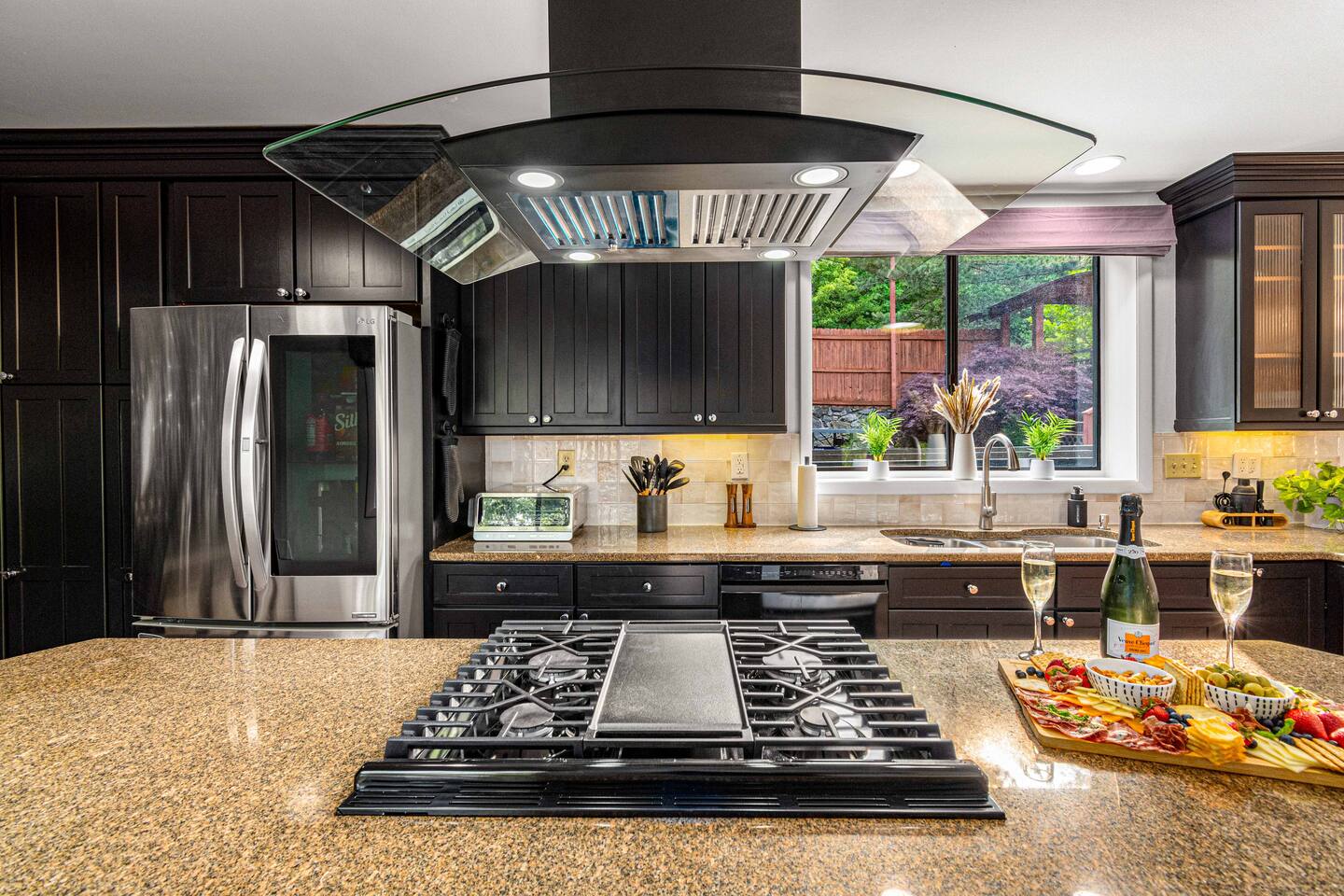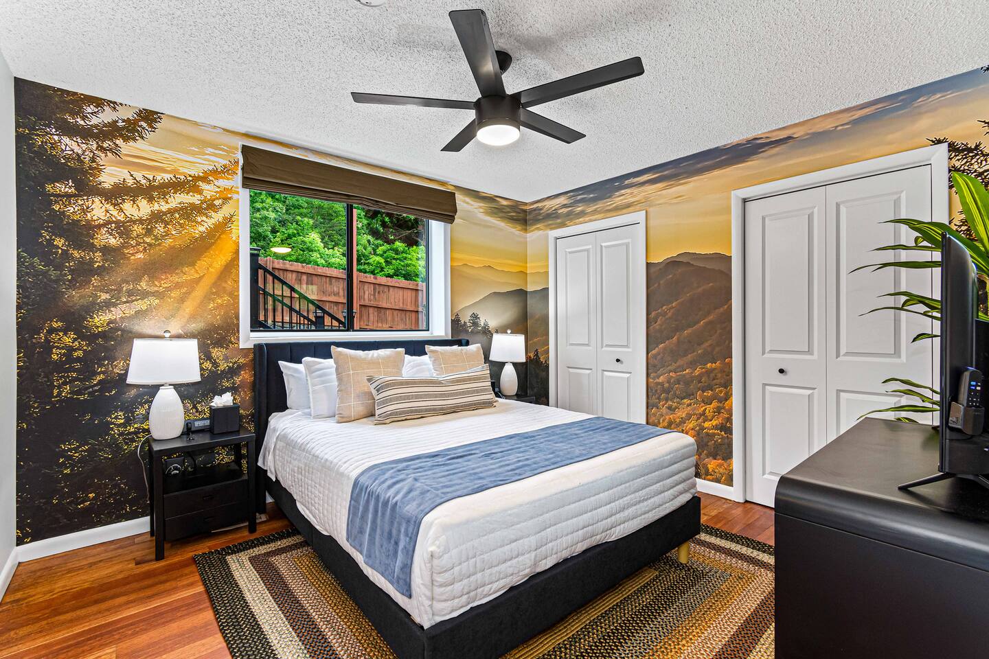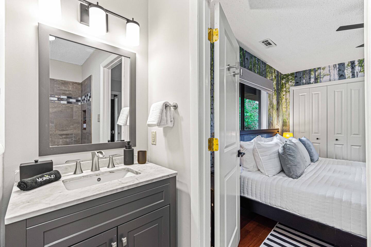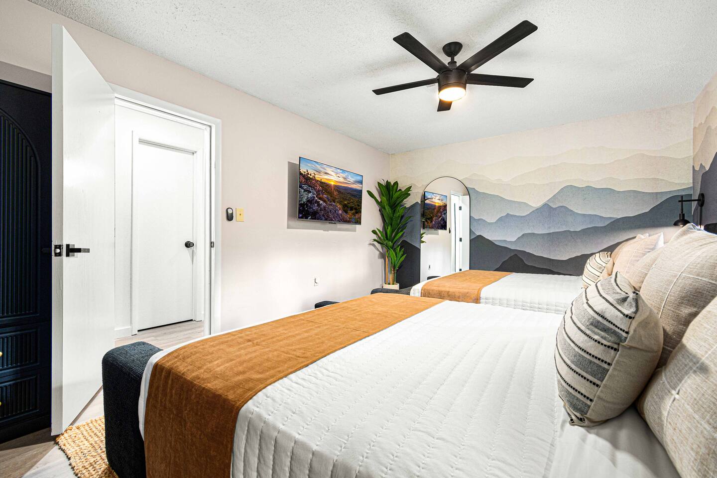 ★ OVERVIEW ★ Nestled in the heart of the breathtaking Blue Ridge Mountains and only a short 12-minute drive from the renowned restaurants and shops in downtown Asheville and a 5-minute drive from the charming town of Weaverville, this stunning designer retreat offers the perfect blend of luxury and fun. Surrounded by lush woodlands, this private 3,200 sq. ft. 6-bedroom, 4-bath mountain haven is on 1.2 acres and can accommodate up to 16 guests. It is designed for unforgettable gatherings, whether you're planning a family reunion, a getaway with friends, or a special celebration. With a fully equipped games room, a movie theater, a 2-lane bowling alley, ping pong, corn hole, a hot tub, fire pit, and mega chess, there is so much to do indoors and out that you may never want to leave. ★ LIVING AREA ★ The luxurious living room offers a serene retreat, featuring an expansive forest mural and a plush teal sectional adorned with vibrant orange cushions. The space is bathed in natural light from large sliding doors, leading to a tranquil deck with lush views. A cozy fireplace and lit art alcoves add elegance, while the modern decor and rich wood floors create a warm, inviting atmosphere perfect for relaxation and entertainment. ✔ Stylish Seating: Sink into the plush seating and indulge in absolute comfort. ✔ Modern Decor: Enjoy the curated ambiance created by the contemporary furnishings and design. ✔ Roku Smart TV: Relax after a day of hiking while watching the 65” TV. ✔ Amazon Echo: Listen to your favorite tunes on this Wi-Fi-enabled speaker. ✔ Gas Fireplace: At the flip of a switch, turn on the ambiance and enjoy the amber glow of the logs while chatting or watching TV. ✔ Games: Have fun with games night! Tons to choose from, including: Monopoly, Dominoes, Bingo, Charades, Codenames, Jenga, Uno, cards, and Jenga. ★ KITCHEN & DINING ROOM★ The gorgeous open kitchen and dining area seamlessly blend style and functionality, making it ideal for both culinary adventures and relaxed mornings. The chef’s kitchen, with its stainless steel appliances, is a culinary haven, perfect for creating memorable meals. The adjacent coffee bar is a cozy nook offering a variety of brews and syrups for coffee, tea, and hot chocolate enthusiasts. Gather around the custom-designed 12-person dining table and enjoy memorable meals in style. ✔ Designer Kitchen: Experience a well-appointed kitchen featuring an island that seamlessly combines elegance with functionality. ✔ Kitchen Amenities: Coffee maker (drip coffee maker & Nespresso), basic cooking essentials (seasonings, condiments, oil, vinegar, organic sugar, coffee, tea, hot chocolate etc.), high-end Hexclad cookware, microwave, full-sized fridge, freezer with ice-maker, gas range, gas oven, dishwasher, rice maker, toaster oven/air fryer, double waffle maker, and blender. ✔ Dining Area: Share delicious meals and create lasting memories around the chic dining table with seating for 12 and a large glass lazy-susan. ★ BEDROOMS ★ The designer decorated bedrooms all offer a tranquil escape, inspired by the surrounding mountains and forests. Each room features stunning nature-themed murals or pictures, creating a serene ambiance. Plush, premium bedding, adorned with Egyptian cotton sheets and elegant decor, complements the natural beauty, while large windows or sliding glass doors offer breathtaking views. Thoughtful touches, such as cozy seating and soft lighting, enhance the restful atmosphere, making these bedrooms a perfect retreat after a day of exploring. ✔ Luxurious Beds: Drift into dreamland on our premium beds with 4 pillows and Egyption cotton sheets. There are extra blankets if needed. ✔ Serene Ambiance: Find solace and tranquility in the tastefully designed bedrooms. ✔ Bedroom Amenities: All bedrooms include Roku Smart TVs, Amazon Echo speakers, ceiling fans, and blackout blinds or curtains. ✔ Primary Bedroom: King canopy bed with private balcony, two walk-in closets, and an en-suite bathroom with jacuzzi tub, separate shower, and makeup table. ✔ Bedroom 2: King bed with en-suite bathroom and bath/shower combo. ✔ Bedroom 3: Queen bed with en-suite bathroom with a shower. ✔ Bedroom 4: Two queen beds and sliding glass door access to outside, along with shared bathroom access with a shower. ✔ Bedroom 5: Two queen beds, along with shared bathroom access with a shower. ✔ Bedroom 6: King bed, along with shared bathroom access with a shower. ★ BATHROOMS ★ The four bathrooms are elegantly designed, each offering a unique blend of style and comfort. Featuring modern fixtures, glass vessel sinks, and sleek tile work, they provide a spa-like experience. Large mirrors and ample lighting enhance the space, while thoughtful details, such as plush towels and high-quality toiletries, ensure a luxurious stay. These bathrooms perfectly complement the serene mountain setting, offering a refreshing retreat. ✔ Modern Bathrooms: Refresh and rejuvenate in the elegantly appointed bathrooms. ✔ Bathtubs/showers: There are two bathtubs (one of them is a jacuzzi tub, one is a combo shower/bathtub), and three stand-alone showers. ✔ Essential Amenities: Enjoy the organic shampoo, conditioner, and body wash along with Q-tips and cotton balls. ★ INDOOR AMENITIES ★ ✔ Theatre: A fully decked out home theatre for 8 guests with a 100” screen, surround sound, leather reclining chairs, a fiberoptic star ceiling, and a snack bar. ✔ Games Room: Challenge your friends or family to a game of pool, poker, or Ms Pac-Man. The room also features a 16’ ceiling, a 65” Roku smart TV, classic arcade games, and board games. ✔ Office: Including a stand-up desk, perfect for digital nomads, helping you stay productive even while on vacation. ✔ Air conditioning/Heating: A central heating and cooling system is installed throughout the house. ✔ Laundry Room: Brand new high-efficiency washer and gas dryer for any laundry needs. ✔ I