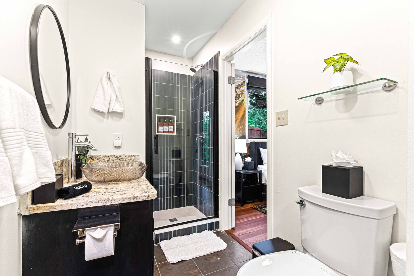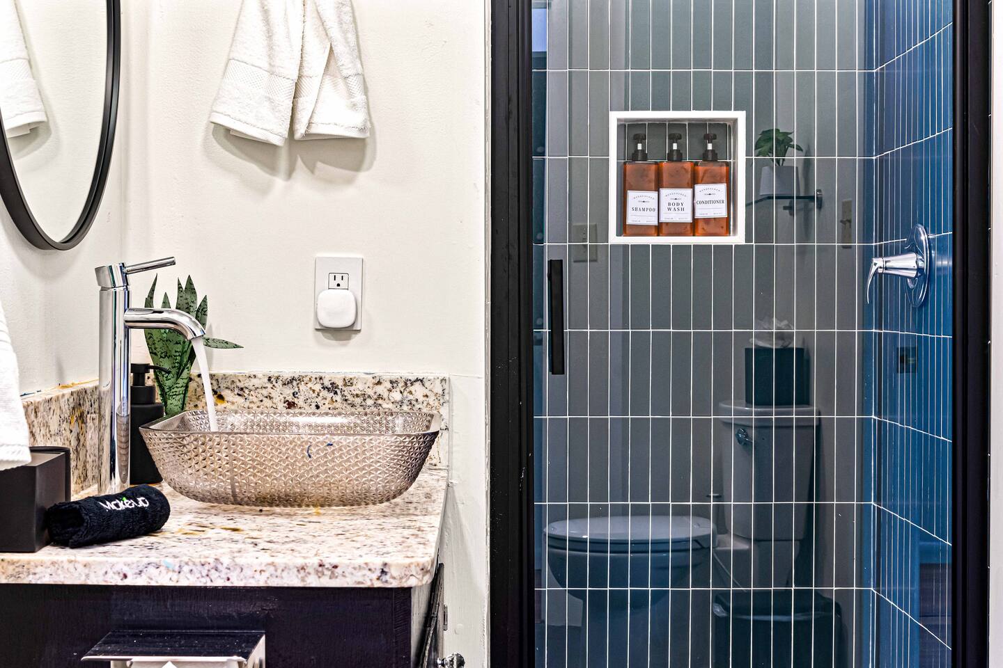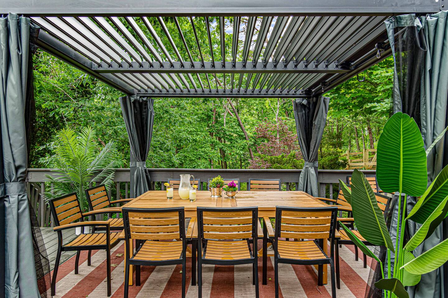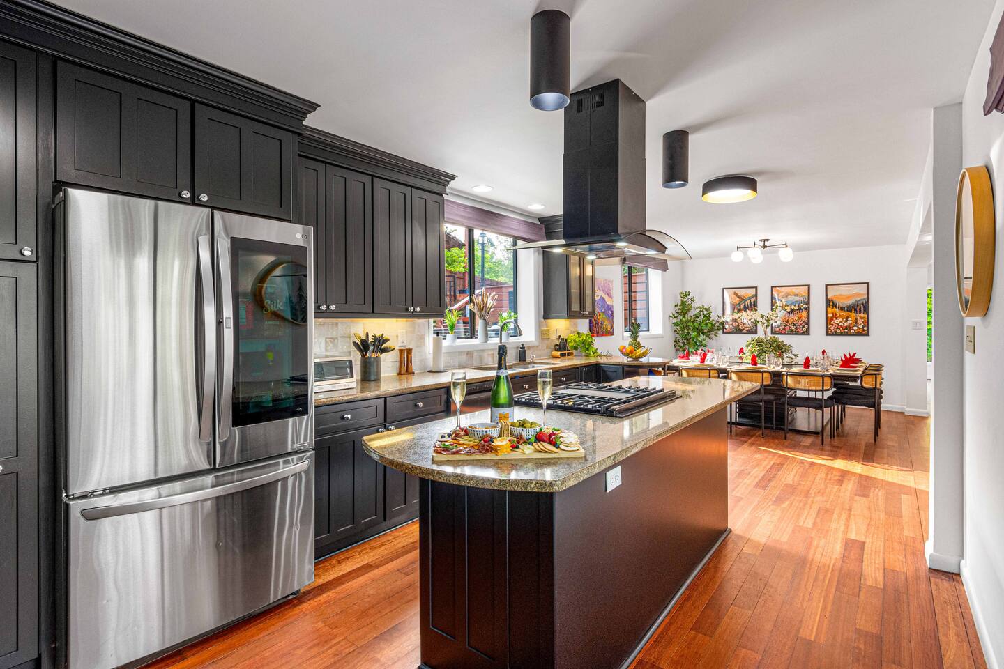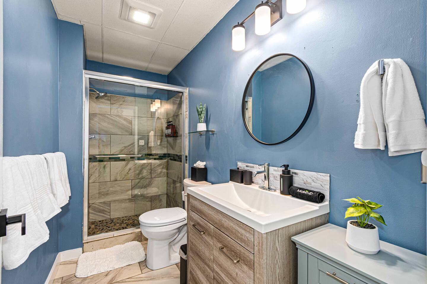 ★ OVERVIEW ★ Nestled in the heart of the breathtaking Blue Ridge Mountains and only a short 12-minute drive from the renowned restaurants and shops in downtown Asheville and a 5-minute drive from the charming town of Weaverville, this stunning designer retreat offers the perfect blend of luxury and fun. Surrounded by lush woodlands, this private 3,200 sq. ft. 6-bedroom, 4-bath mountain haven is on 1.2 acres and can accommodate up to 16 guests. It is designed for unforgettable gatherings, whether you're planning a family reunion, a getaway with friends, or a special celebration. With a fully equipped games room, a movie theater, a 2-lane bowling alley, ping pong, corn hole, a hot tub, fire pit, and mega chess, there is so much to do indoors and out that you may never want to leave. ★ LIVING AREA ★ The luxurious living room offers a serene retreat, featuring an expansive forest mural and a plush teal sectional adorned with vibrant orange cushions. The space is bathed in natural light from large sliding doors, leading to a tranquil deck with lush views. A cozy fireplace and lit art alcoves add elegance, while the modern decor and rich wood floors create a warm, inviting atmosphere perfect for relaxation and entertainment. ✔ Stylish Seating: Sink into the plush seating and indulge in absolute comfort. ✔ Modern Decor: Enjoy the curated ambiance created by the contemporary furnishings and design. ✔ Roku Smart TV: Relax after a day of hiking while watching the 65” TV. ✔ Amazon Echo: Listen to your favorite tunes on this Wi-Fi-enabled speaker. ✔ Gas Fireplace: At the flip of a switch, turn on the ambiance and enjoy the amber glow of the logs while chatting or watching TV. ✔ Games: Have fun with games night! Tons to choose from, including: Monopoly, Dominoes, Bingo, Charades, Codenames, Jenga, Uno, cards, and Jenga. ★ KITCHEN & DINING ROOM★ The gorgeous open kitchen and dining area seamlessly blend style and functionality, making it ideal for both culinary adventures and relaxed mornings. The chef’s kitchen, with its stainless steel appliances, is a culinary haven, perfect for creating memorable meals. The adjacent coffee bar is a cozy nook offering a variety of brews and syrups for coffee, tea, and hot chocolate enthusiasts. Gather around the custom-designed 12-person dining table and enjoy memorable meals in style. ✔ Designer Kitchen: Experience a well-appointed kitchen featuring an island that seamlessly combines elegance with functionality. ✔ Kitchen Amenities: Coffee maker (drip coffee maker & Nespresso), basic cooking essentials (seasonings, condiments, oil, vinegar, organic sugar, coffee, tea, hot chocolate etc.), high-end Hexclad cookware, microwave, full-sized fridge, freezer with ice-maker, gas range, gas oven, dishwasher, rice maker, toaster oven/air fryer, double waffle maker, and blender. ✔ Dining Area: Share delicious meals and create lasting memories around the chic dining table with seating for 12 and a large glass lazy-susan. ★ BEDROOMS ★ The designer decorated bedrooms all offer a tranquil escape, inspired by the surrounding mountains and forests. Each room features stunning nature-themed murals or pictures, creating a serene ambiance. Plush, premium bedding, adorned with Egyptian cotton sheets and elegant decor, complements the natural beauty, while large windows or sliding glass doors offer breathtaking views. Thoughtful touches, such as cozy seating and soft lighting, enhance the restful atmosphere, making these bedrooms a perfect retreat after a day of exploring. ✔ Luxurious Beds: Drift into dreamland on our premium beds with 4 pillows and Egyption cotton sheets. There are extra blankets if needed. ✔ Serene Ambiance: Find solace and tranquility in the tastefully designed bedrooms. ✔ Bedroom Amenities: All bedrooms include Roku Smart TVs, Amazon Echo speakers, ceiling fans, and blackout blinds or curtains. ✔ Primary Bedroom: King canopy bed with private balcony, two walk-in closets, and an en-suite bathroom with jacuzzi tub, separate shower, and makeup table. ✔ Bedroom 2: King bed with en-suite bathroom and bath/shower combo. ✔ Bedroom 3: Queen bed with en-suite bathroom with a shower. ✔ Bedroom 4: Two queen beds and sliding glass door access to outside, along with shared bathroom access with a shower. ✔ Bedroom 5: Two queen beds, along with shared bathroom access with a shower. ✔ Bedroom 6: King bed, along with shared bathroom access with a shower. ★ BATHROOMS ★ The four bathrooms are elegantly designed, each offering a unique blend of style and comfort. Featuring modern fixtures, glass vessel sinks, and sleek tile work, they provide a spa-like experience. Large mirrors and ample lighting enhance the space, while thoughtful details, such as plush towels and high-quality toiletries, ensure a luxurious stay. These bathrooms perfectly complement the serene mountain setting, offering a refreshing retreat. ✔ Modern Bathrooms: Refresh and rejuvenate in the elegantly appointed bathrooms. ✔ Bathtubs/showers: There are two bathtubs (one of them is a jacuzzi tub, one is a combo shower/bathtub), and three stand-alone showers. ✔ Essential Amenities: Enjoy the organic shampoo, conditioner, and body wash along with Q-tips and cotton balls. ★ INDOOR AMENITIES ★ ✔ Theatre: A fully decked out home theatre for 8 guests with a 100” screen, surround sound, leather reclining chairs, a fiberoptic star ceiling, and a snack bar. ✔ Games Room: Challenge your friends or family to a game of pool, poker, or Ms Pac-Man. The room also features a 16’ ceiling, a 65” Roku smart TV, classic arcade games, and board games. ✔ Office: Including a stand-up desk, perfect for digital nomads, helping you stay productive even while on vacation. ✔ Air conditioning/Heating: A central heating and cooling system is installed throughout the house. ✔ Laundry Room: Brand new high-efficiency washer and gas dryer for any laundry needs. ✔ I