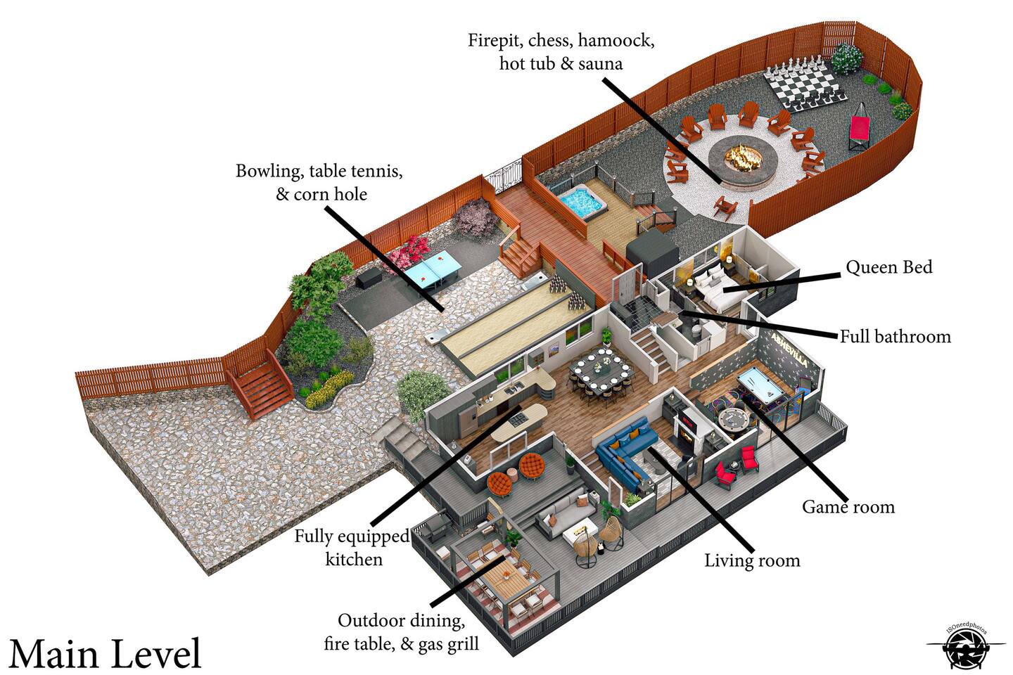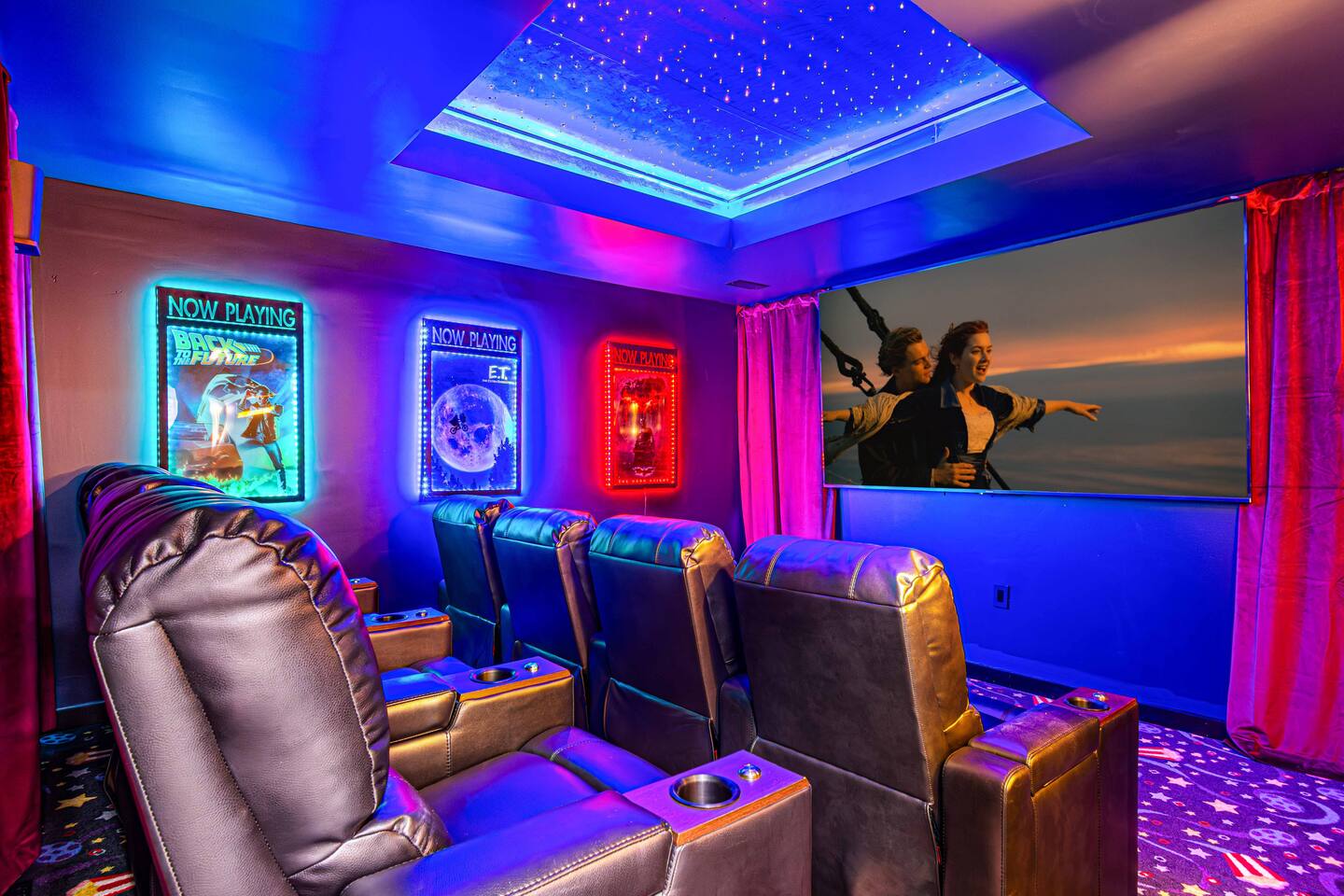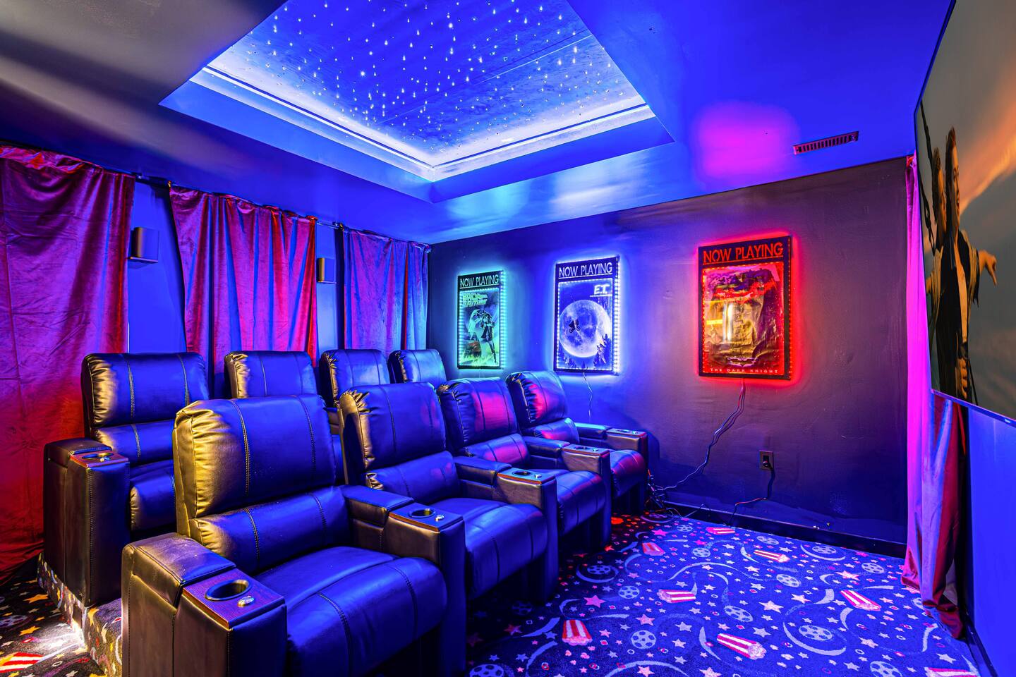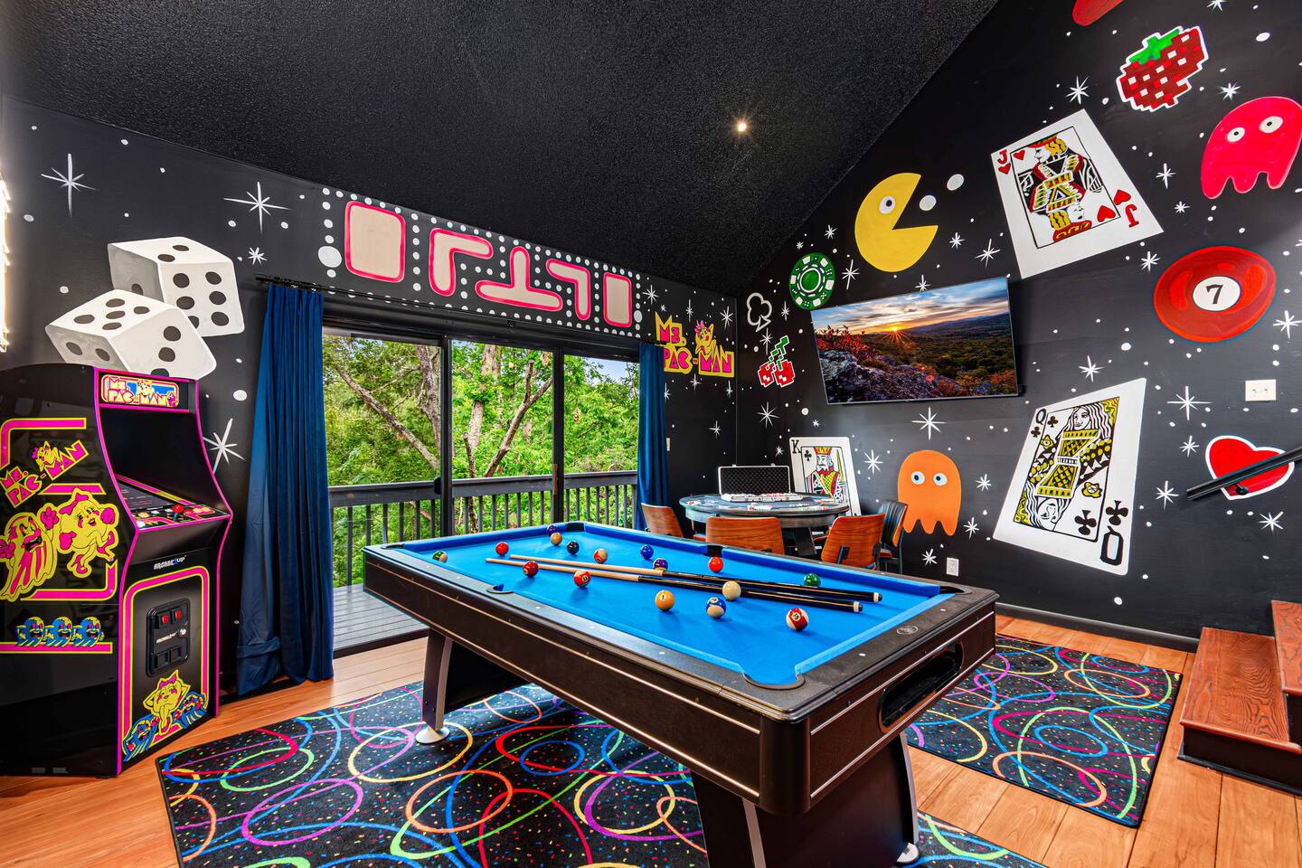 ★ PROPERTY HIGHLIGHTS ★ ✔ Spa: Unwind in the 8-person spa. ✔ Games: Ping pong, bowling, mega chess, pool, Ms. Pac-Man, poker, and more. ✔ Theatre: Enjoy a 100” screen, surround sound, and comfy leather chairs. ✔ BBQ: Savor BBQ meals al fresco at a table for 12. ✔ Fire Pit: Gather with 12 friends, wine in hand, by the crackling fire.